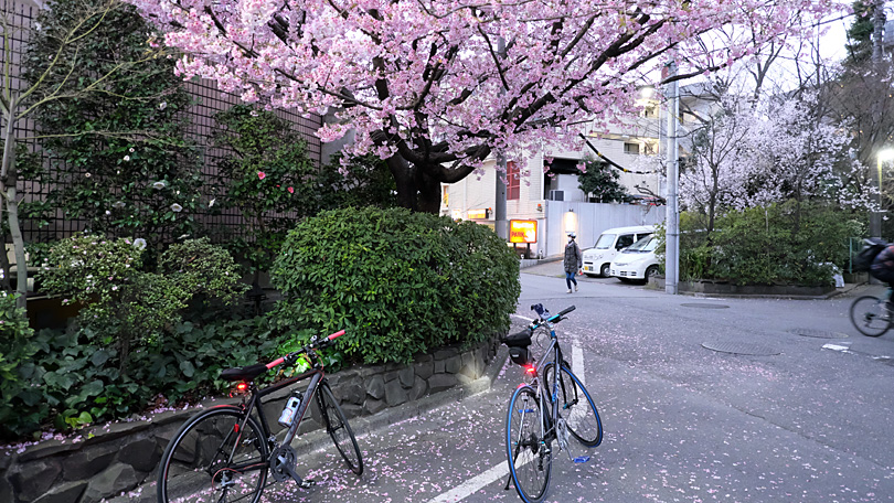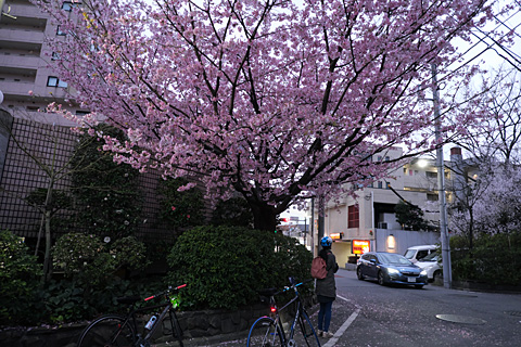 薄暗くなった帰り道。街角に色の濃い桜が満開になっていた。暖かくなるのも近い。