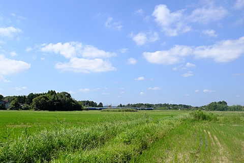 真っ青な秋空の下,ボクらは上総の原風景のような美しい田園の里を行く。人が来るとは予想だにしていなかったのだろう,前方で水辺の鷺や苅田のバッタが慌てて飛び立つ。逃げ遅れた大きなバッタが顔に飛んできて後方でドレミの悲鳴があがる。