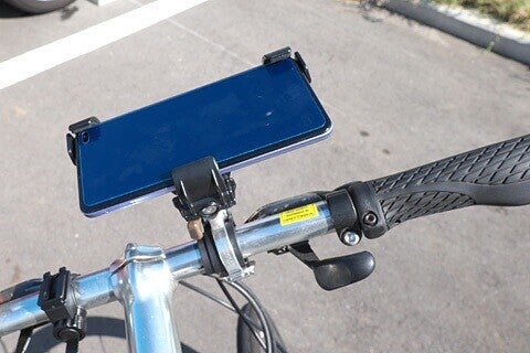 夏休み前に買った新兵器のジョイント部品でスマホをジャイアントに装着。スマホが規格外サイズだったために,部品が驚くほど値の張るシロモノになってしまったが,これで地図を確認するたびにドレミのバックパックから彼女のスマホを取り出して起ち上げるという手間がなくなるだろう。