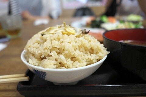 プラス50円のサザエご飯。ドレミが飛び上がって厨房に走り,自分の分を小盛にするように頼んだ。おばさんが豪快に笑った。そもそもこのおばさんの明るい声に惹かれてここまで自転車を走らせてきた。福寿寺の門前で営業確認の電話をしたとき,ドレミのスマホから近くに立って地図を見ていたボクの耳にまで響き渡る元気な声だったのだ。