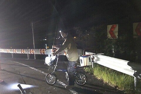 仕事が終わった午後10時に江東区にある職場を出ると12時前には三島に到着する。伊豆縦貫道を長岡まで下り西浦の海岸に出た。漁港の駐車場で自転車を下ろし海沿いの道を5分ほど戻る。