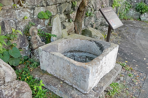 案内板に導かれて政子が産湯の井戸にたどり着く。真偽はともかく,現在残っている井戸自体は正四角柱の石を正円にくり抜いて作られていた。機械による加工技術と思われる。