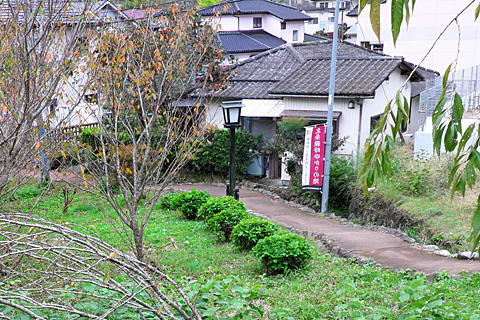 桂川沿いをえっちらおっちらと漕いで温泉街の外れまで上った。さらに北側の斜面を上ると民家に混じって旅館の従業員宿舎やアパートが点在している。