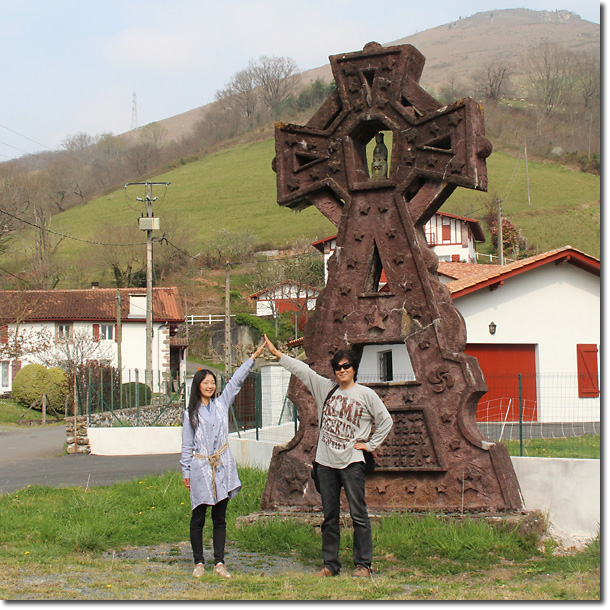 ←これは「ピロタ」というバスク独特の球技の屋外球技場です。誰か村人がいたら練習の様子を撮らせてもらおうと思ったのですが,あいにく誰もいません。ちょっと失礼して代わりにボクたちがポーズしました。テニスの壁打ちを素手でやるようなスポーツです。