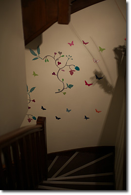 寝静まっていますが裏口の鍵をもらってあります。起こさないように抜き足差し足。それにしても,さすが芸術の国フランスです。田舎の小さなホテルのしかも階段の壁がこのありさまです。