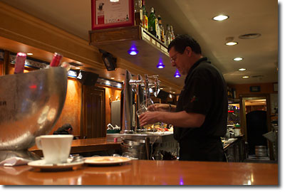 バールをはしごしながら,好みのピンチョスでワインやビールを飲むのが粋です。だから若い人たちには止まり木や樽のテラス席が人気です。