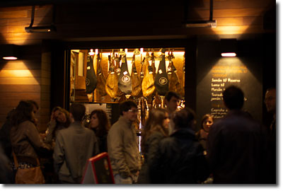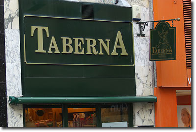 「Taberna」という看板があちこちにあります。たべるな…食べるな?…ではなく,料理がウリのバールのことです。他にも「お年寄り専門,若者立ち入り禁止」の店や生ハムづくしの人気店などさまざまな特長がウリの店もあって,しばし町中はお祭のような賑わいに包まれます。