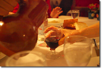 目を覚ますとすでに店は開店し,やたらと賑わっています。ワインのピッチャーがあちらこちらに置かれ,ほぼ宴会の様相です。