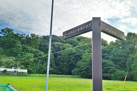 案内板に導かれて政子が産湯の井戸にたどり着く。真偽はともかく,現在残っている井戸自体は正四角柱の石を正円にくり抜いて作られていた。機械による加工技術と思われる。