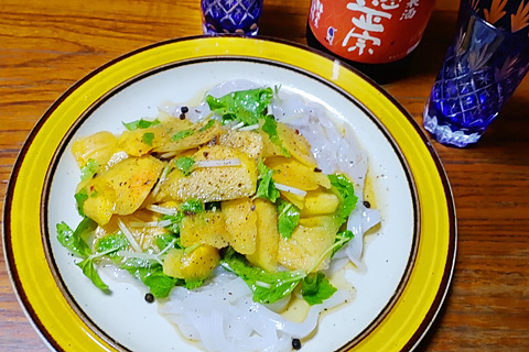 旅の荷物を片付け,清水町の柿,駿河湾のイカ,修善寺のミツバをカルパッチョに仕立て,沼津OEMの地酒を飲った。