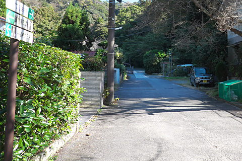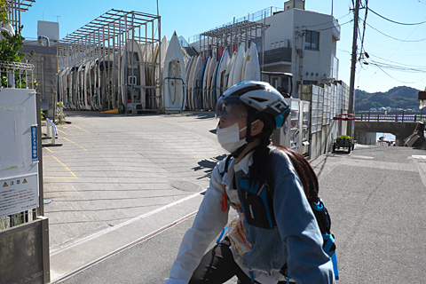 熱心に地図を確かめている。 この海岸は標高100m近い披露山の麓にあたる。源頼朝が貢物の披露会場として使ったと言い伝えられているようだが,現代は著名人の邸宅,別宅が立ち並ぶ超高級住宅街である。うっかり自転車で山に向かうとタイヘンな高低差となろう。 駐車場に隣接するように建つウインドサーフショップに「いかにも」のおじさんが開店準備をしているのが見えたので道を聞いた。