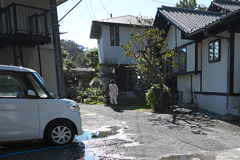 庭で洗車をしている女性がいたので尋ねてみると,首を傾げながらちょっと待ってとホースの水を止めてくれた。