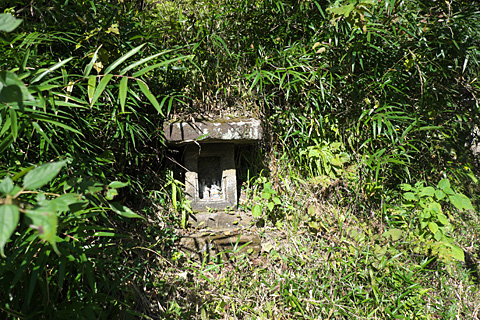 鎖の脇まで戻ると崖の茂みの中に小さな石の祠を見つけた。どうやらこれが梶原井戸らしい。