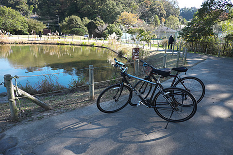 小路が山に突き当たって右に折れる。その角に小さな公園があったので自転車を停めさせてもらう。