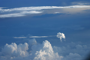 窓の外は真夏の強い日射しが作る積乱雲が美しく重なりあって,束の間の水平飛行はまるで雲海を滑るような穏やかさだ。