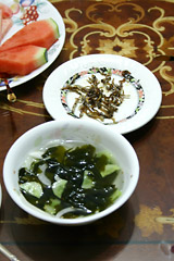 二日間,半徹夜明けの体に心地よく酔いが回る。ソウジュは日本人にはちょっと甘すぎる焼酎だが,飲み心地のワリには強い。そっとドレミとアイコンタクトすると,いつもは体調を気遣ってきびしく管理する彼女の目がGOサインを出している。オモニがボクらのために用意してくれた料理はどれも美味しく,とくにワカメとキュウリの酢のものは,ここ2週間,コンビニ弁当ばかりだった舌に優しかった。日本と同じ味だが,酢を水で少しうめてあって,冷たいスープのようにスプーンで飲んだりもする。