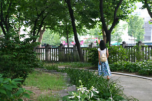 ミョンドンの商店街をぴったり30分ひやかして,歩いて行けそうなタプコル公園に向かって歩いた。小じんまりした公園だが,韓様式の立派な門がある。カメラアングルに気を取られてボクが門の敷居にちょっとつまづくと,ドレミはこおどりして喜ぶ。さっきミョンドンで目の前にあった30cmはあるコンクリの路柱にけつまづいてボクに叱られたからだ。