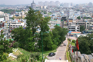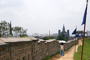 ふだん,朝は寝床でぐずっているのを,ドレミが3回くらいに分けて根気よく起こしてくれる。ところが旅先ではいつもボクの方が早い。スーオン(水原)の朝も当然ボクがまず起き出し,クーラーを切って窓を開け放った。朝食は前夜コンビニで買っておいたサンドイッチと缶コーヒー。スーオン(水原)華城は,李朝22代正祖が1796年に漢城(ソウル)からこの地に都を移そうとして築いたものだ。彼の死によって遷都計画は実現しなかったが,城壁は日本軍の侵略を免れて現在に残り,世界遺産に指定されている。
