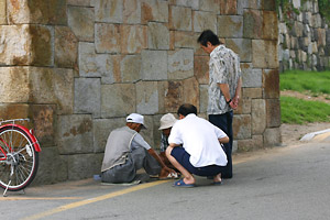 平安門の見えるロッテリアで遅いお昼を食べ,コンビニで買ったペットボトル飲料も香りの良い緑茶にあたった。不思議なもので,炎天下を歩くのに体が慣れてくる。気温はさらに上がっているのに,午前中ほどは辛くない。城壁は町を左右に分けながら美しい緑の丘を作って続く。道路をまたぐ石橋の日陰で数人の男が将棋に興じている。