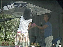 言葉もわからないのに,売り子さんと談笑しながら,まだ青いもぎたてりんごを二個だけ購う。