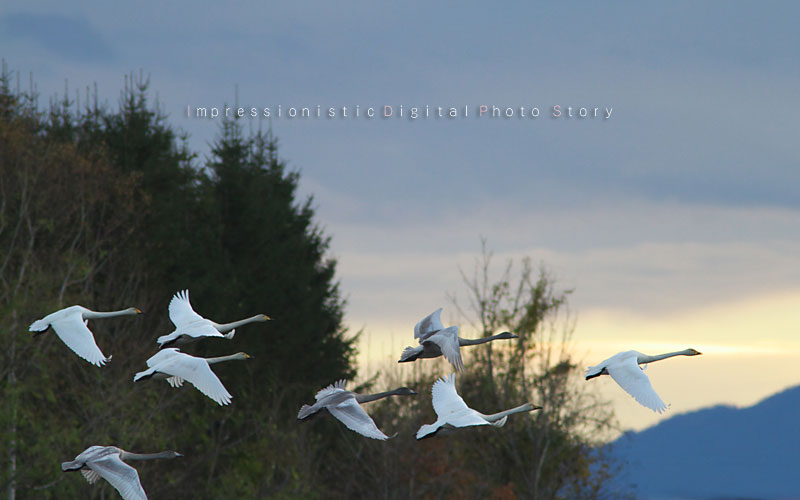 風上の 北西に向かって離陸し,上空で旋回して南へ飛んで行く。まるでハクチョウたちの航空ショーである。雨上がりの泥田にはボクたち二人しか観客がいない。