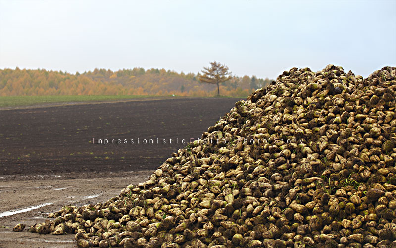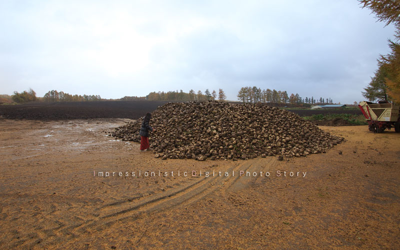 収穫の終わった美幌のとあるビート畑である。ドレミのたっての希望で,クマのパパが知り合いの農家に見学を頼んでくれた。ビートは順番がくるまでこうして野積みされている。