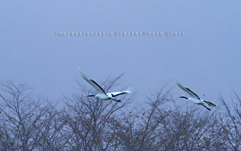タンチョウの番いは本当に仲が良く,一生涯添い遂げます.よく知られているラブダンスも夫婦のペアで舞われます.メスがオスの近くまで寄ってきて,二羽は同時に舞い上がり,灰色の空に溶けて行きました.