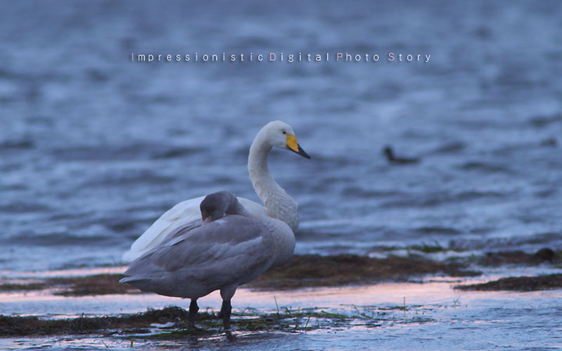 夕べ民宿の老主人が教えてくれた秘密の撮影ポイントに行ってみると…いましたいました,ハクチョウです.でも肝心の紅い斜光がありません.東には例のわらじのような雨雲が居座って,朝日どころか墨を流したように真っ黒の空です.まだしも西の空は明るく,すぐ隣の厚岸まで行けば晴れているでしょう.