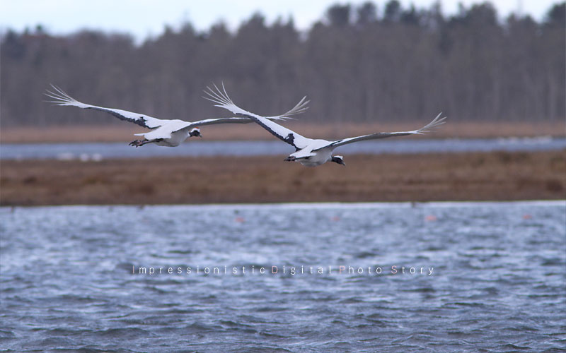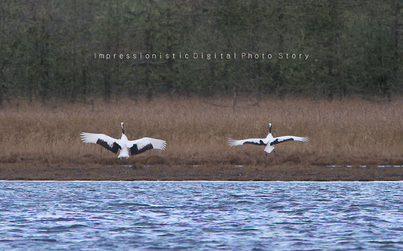 ツルです.番いのタンチョウが羽を休めています.慎重に位置を変えてサンヨンを構えなおす頃には早くもオスが気配に気づいてメスを呼び寄せています.間もなくざくざくと羽ばたいたかと思うと,春国岱の洲に向けて飛び去っていきました.もちろん,一部始終はファインダーの中,7Dの高速連写がうなり,動画のような50カットほどを記録しました.