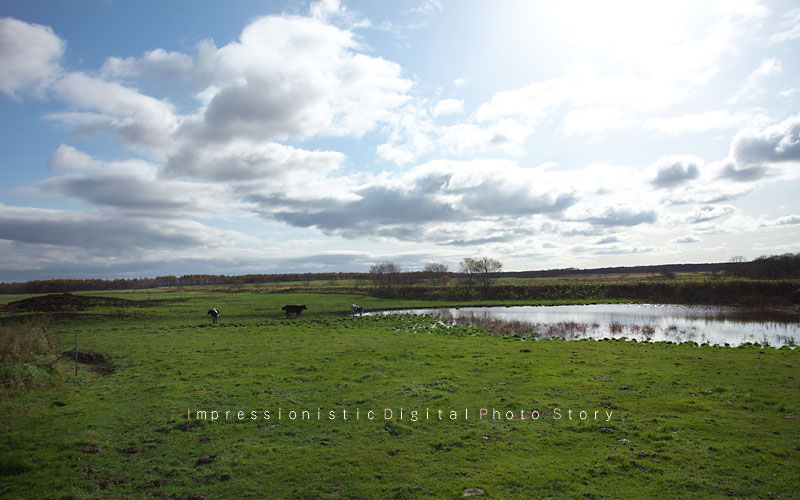 ようやく晴れた自由な一日, 気になる小道は入ってみます.別海町の美しい牧場風景が続いています.何回目かの小道アタックでこの沼に当たりました.すると対岸にまたしても番いのタンチョウが舞い降りて来たではありませんか.