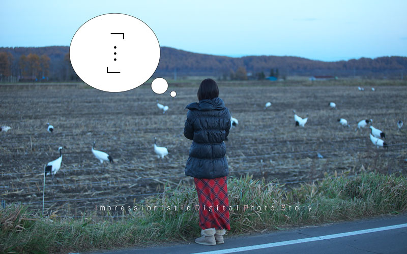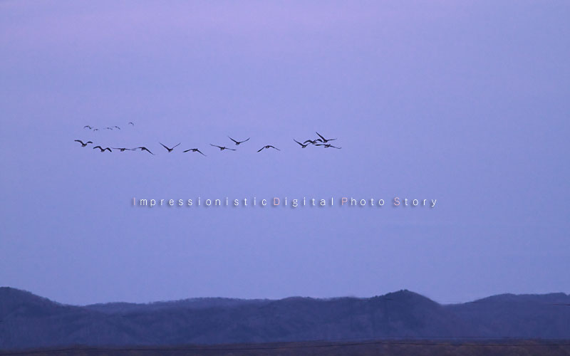 一組の夫婦がなき交わしを始めました.オスがくわぁー,メスが応えてくぁっくぁっ.三拍子,ワルツのリズムです.いったん離れて,向かい合い,踊りながら近づきます.すれ違いざまに美しく体を反らせながらひときわ高く鳴きます.一度雪上でそのシーンを見てしまったら,もう病みつき,きっとタンチョウの魅力にはまってしまいますよ.