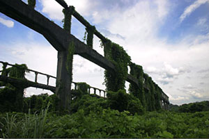 倒壊の恐れがあるからだろう,建物はぐるりと鉄条網で囲まれていたが,少し離れた場所に杭の隙間があった。ボクは好奇心に勝てず,ドレミを車に帰して隙間から中に入ってみた。コンクリートでできた内部は三階建てほどの高さがあるが,フロアが仕切られた形跡はない。高い天井に円形の天窓があって真っ直ぐに地面まで光が落ちていた。