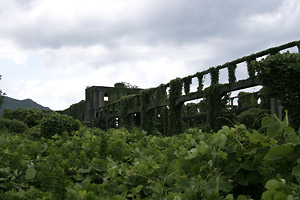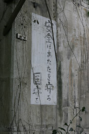 壁を見るとところどころに戦時中を思わせるような標語が残っている。とても巨大で細長く途中からは壁や天井のない鉄筋の骨だけが続いていた。