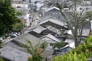 記念碑や足湯などは最近作られたたもので見るべきものはなかったが,丘から見下ろすと港付近に重なる瓦屋根が美しかった。