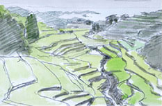 暑さはピークに達して地面近くの空気が歪んで見えるようだ。容赦なく降り注ぐ日射しの中を撮影を終えたボクたちはそろそろと駐車場に戻る。まるで熱いお湯につかっているときのように空気をかきまわすと余計に暑いからだ。丘の緑がまぶしいほど青い。このあたりの棚田を高台から見下ろすとまたとても美しいのだが,