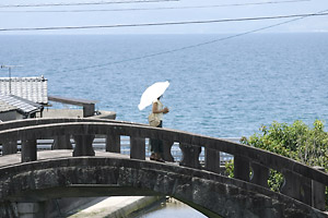 天草灘に臨む小さな眼鏡橋はこの小浜の町外れにある。ここはどうしても写真を撮りたかったので覚悟を決めて車を降りた。