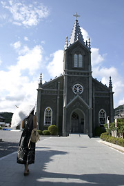 お気に入りの岸壁に車を停めてカメラを構えた。どうだろう,この漁村に立つ天主堂のたたずまいは!ドレミが車の中でのびをした。ボクはしばらく望遠レンズを振り回してファインダー越しに,とんびを追った。十数年前と変わらぬ景色の中,夏の日は長く,一瞬ときが止まっているのではないかと錯覚する。