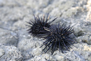 ウニを割ろうと石を振り上げると