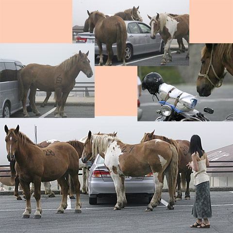 周りも手を出せない。一頭でもかなり迫力のある巨体が群れているので,下手に追って興奮させたりしたらどうなるかわからないからだ。駐車場には小さな子どもも歩いている。馬たちは逃げ遅れた車を次々に犠牲にしてゆく。単車は荷物を食いちぎられて,テントや寝袋が散乱した。