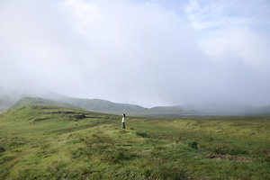沼の反対側を回り,烏帽子岳の裾野に登ってみた。まだ,ほとんど観光客は草千里の中には歩いていない。霧の晴れ間から強い朝日が差してくる。