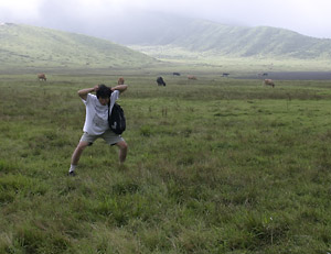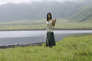 馬にくらべると牛は断然おとなしい。霧が晴れかけたところで草千里の丘に一番乗りした。