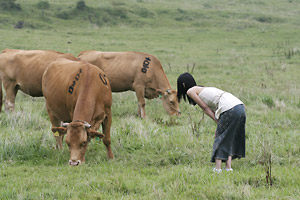 小山の反対側で草を食んでいる二頭の牛に出くわした。ボクも驚いたが彼等も目を丸くして固まっている。長いにらみあいが続く。