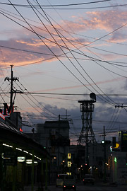 ほろ酔いで焼きそば屋さんを出ると空がピンク色に染まっていた。ひと気のない商店街をボクたちもピンク色に染まりながら歩いて駅前のベンチに腰掛けた。見知らぬ町の旅の空を夕日が七色に変えていく。