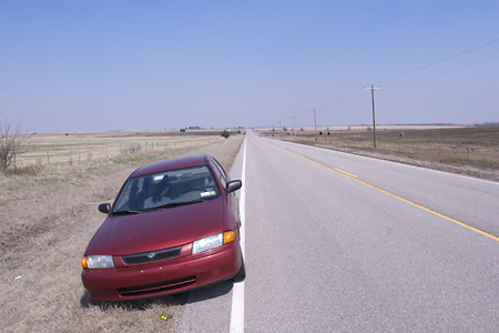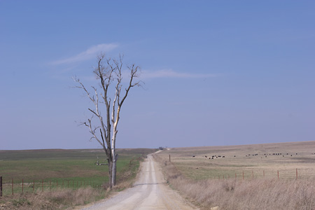 太陽に向かってひたすら南下する。アクセルに石でも置いてボクも居眠りしたいくらい真っ直ぐな道が,ゆるやかな丘陵を登ったり下ったりする。牛もオイルウェルも地平線もさすがに見飽きた。