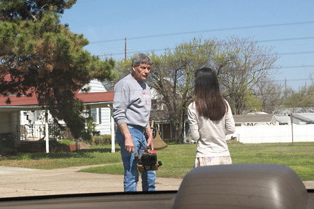腰を伸ばして一服する間に,通りがかった車から夫婦が