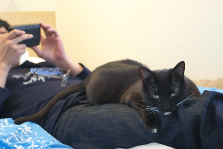 ベッドに寝転んでストレージ(携帯ハードディスク)の写真を整理し始めると,ミミがやってきてぴょんと膝に乗る。人見知りする猫と猫が苦手なボクは互いに譲歩しあいながらとうとう仲良しになった。