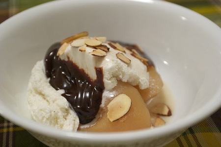 洋梨のコンポートにアイスクリームとチョコと焼いたアーモンド。