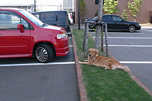 駐車場の芝生が日陰になっていたため,思い切ってタローを外につないで待たせてみた。注文を待つ間,ドレミと交互にこっそり様子を見に行ったが,驚いたことに,ステイをかけられたこの姿勢のまま,とうとう30分近く微動だにしなかった。