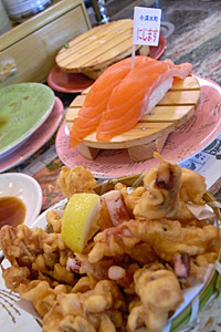 6)お昼は北見の回転寿司トリトンでゲソ揚げとタコ足とサーモンを食べる。