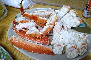 今夜は競りの首尾がよかったらしく,皿に山盛りのタラバガニが運ばれてきた。ドレミとつばさが競って食べ始める。